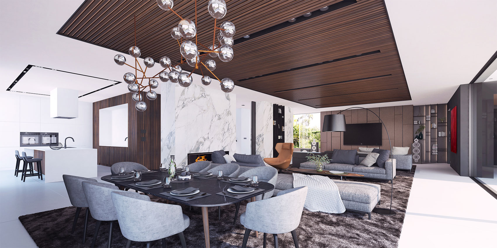 Rozdíl mezi vilou a rodinným domem? Tři patra, tři fasády, tři funkce. Vše zabaleno do zalomené bíle stuhy, která definuje objem a funkce. Prosklené fasády odlehčují celkový výraz. Blok zázemí, o který se opírá celá konstrukce. Piano nobile uprostřed jako srdce celého domu.